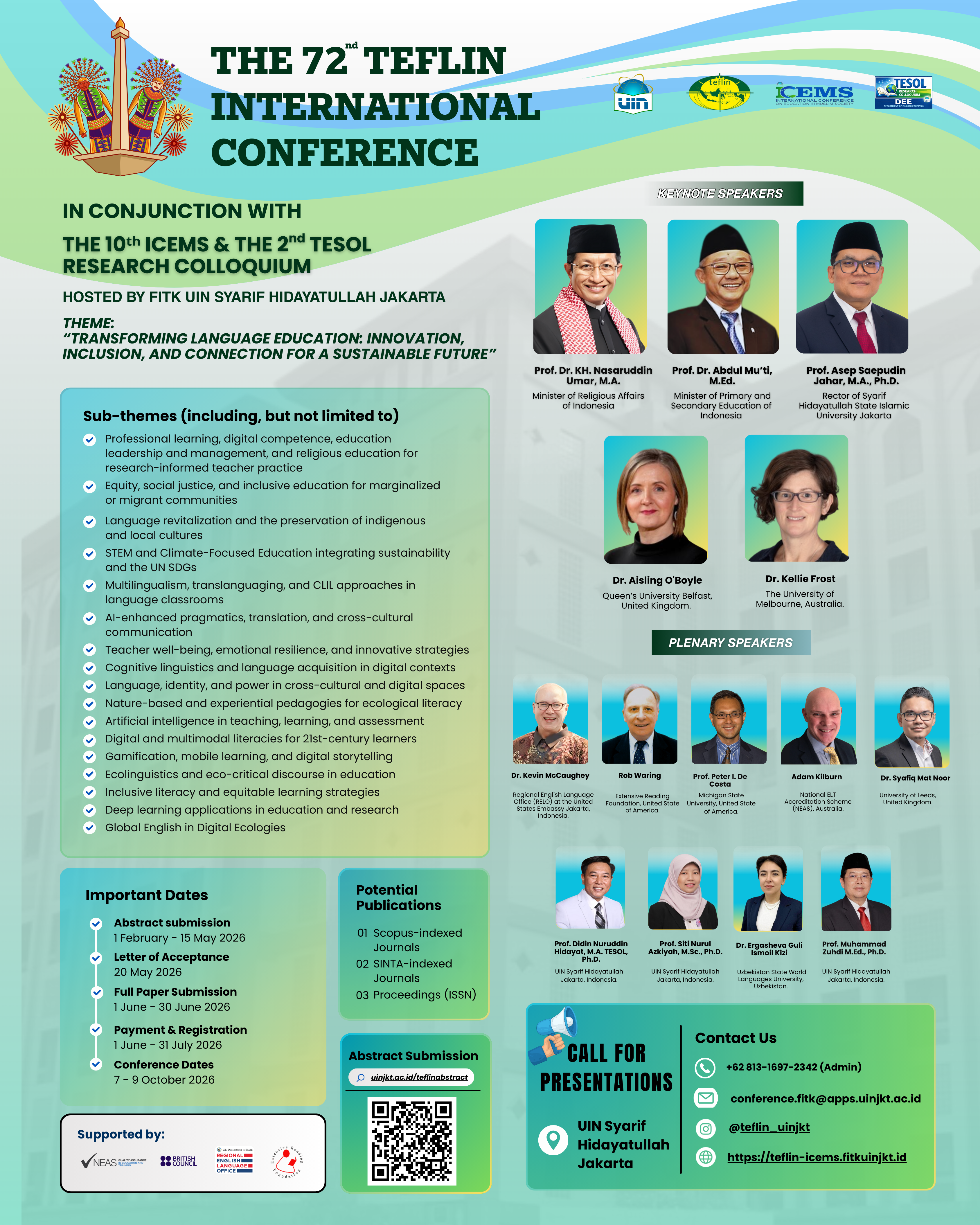 The Faculty of Educational Sciences, UIN Syarif Hidayatullah Jakarta, Indonesia is delighted to invite you to participate in The 72nd TEFLIN International Conference in conjunction with the 10th International Conference on Education in Muslim Society and the 2nd TESOL Research Colloquium, centered on the theme “Transforming Language Education: Innovation, Inclusion, and Connection for a Sustainable Future,” which will be held on 7 – 9 October 2026.